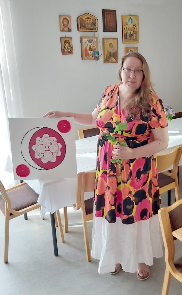 Olen heinolalainen uskontotieteilijä, kuvataiteilija, runoilija, kirjailija ja opettaja. Kasvoin hoitajaäitini kanssa maaseutuvanhainkodissa Hyvinkään Ridasjärven kylässä. Asuimme äitini kanssa vanhainkodin alueella. Äitini oli innokas virkkaaja ja opetti taidon minullekin. Koristelimme kotimme pitseillä: niitä oli ovien ikkunoissa, verhoina, tyynyjen päällisinä ja vaatteina. Pitsimaalausten tekeminen merkitsee minulle sisäisen lapseni hoitamista, psyykkistä eheyttä, ja siksi kutsun niitä mandaloiksi tai lohtumaalauksiksi. Jatkan äitini perinnettä, kuulun sukupolvien ketjuun ja vahvistan omaa naiseuttani. Materiaaleilla ja väreillä leikkiminen antaa mielihyvää, jota tunsin lapsena hoitajaäidin tyttärenä.